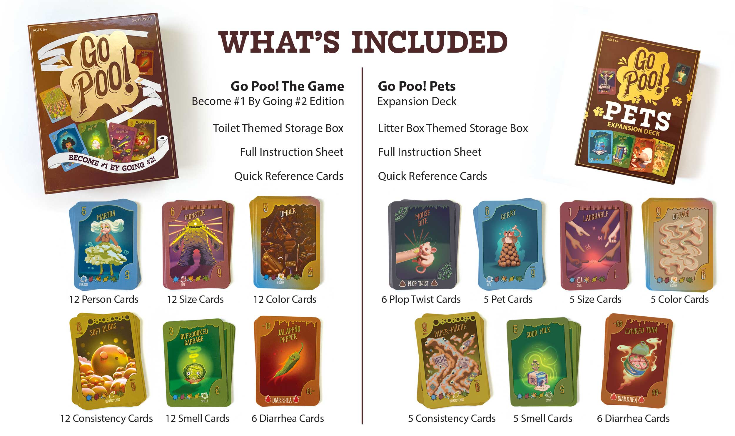 Players collect cards by stealing them from others or picking from the Toilet. Once one card from each Category is collected, Players can take a poo and win points. The grosser the poo, the more the points! But watch out for diarrhea cards which will lose you points and end your turn!